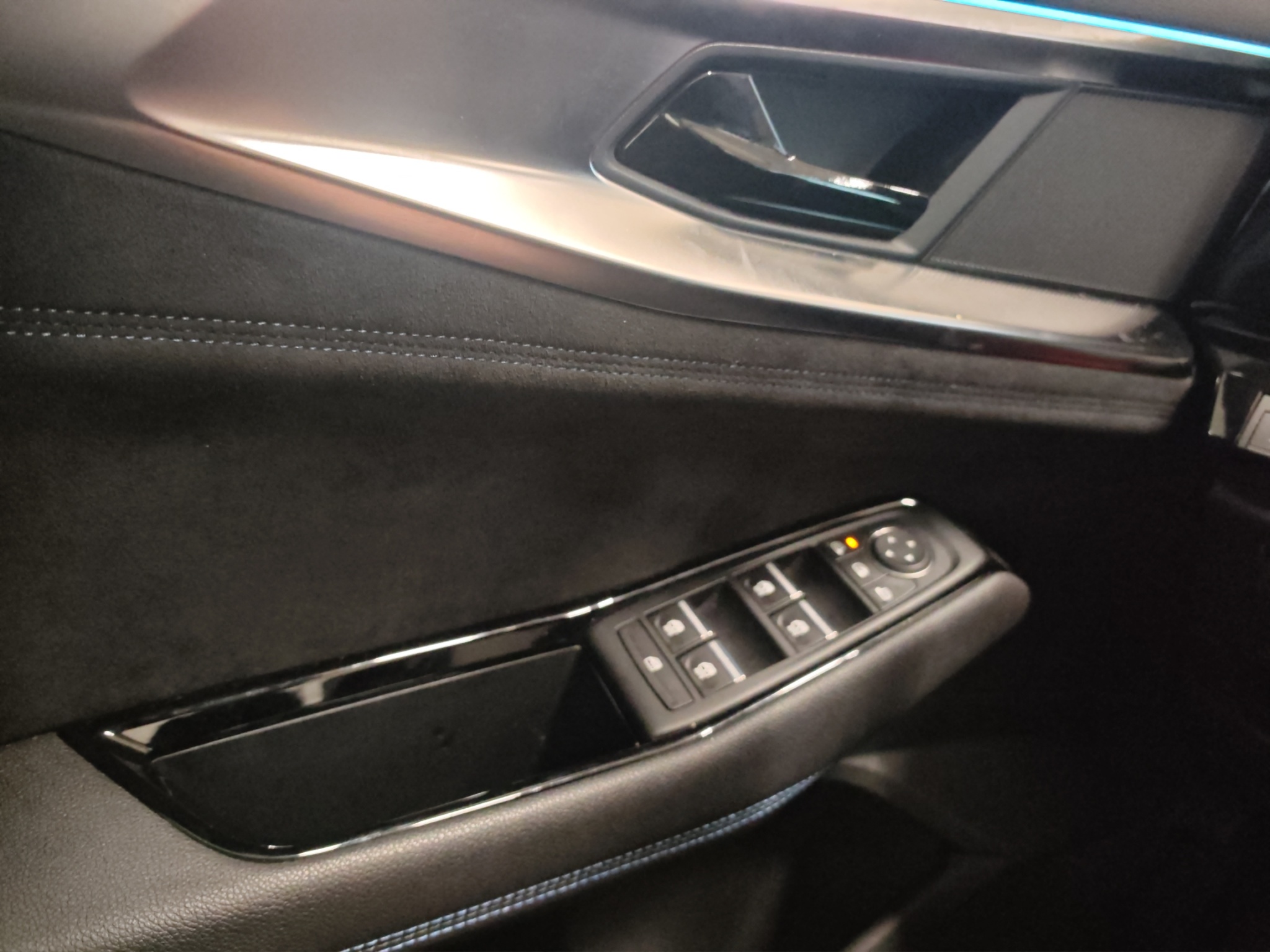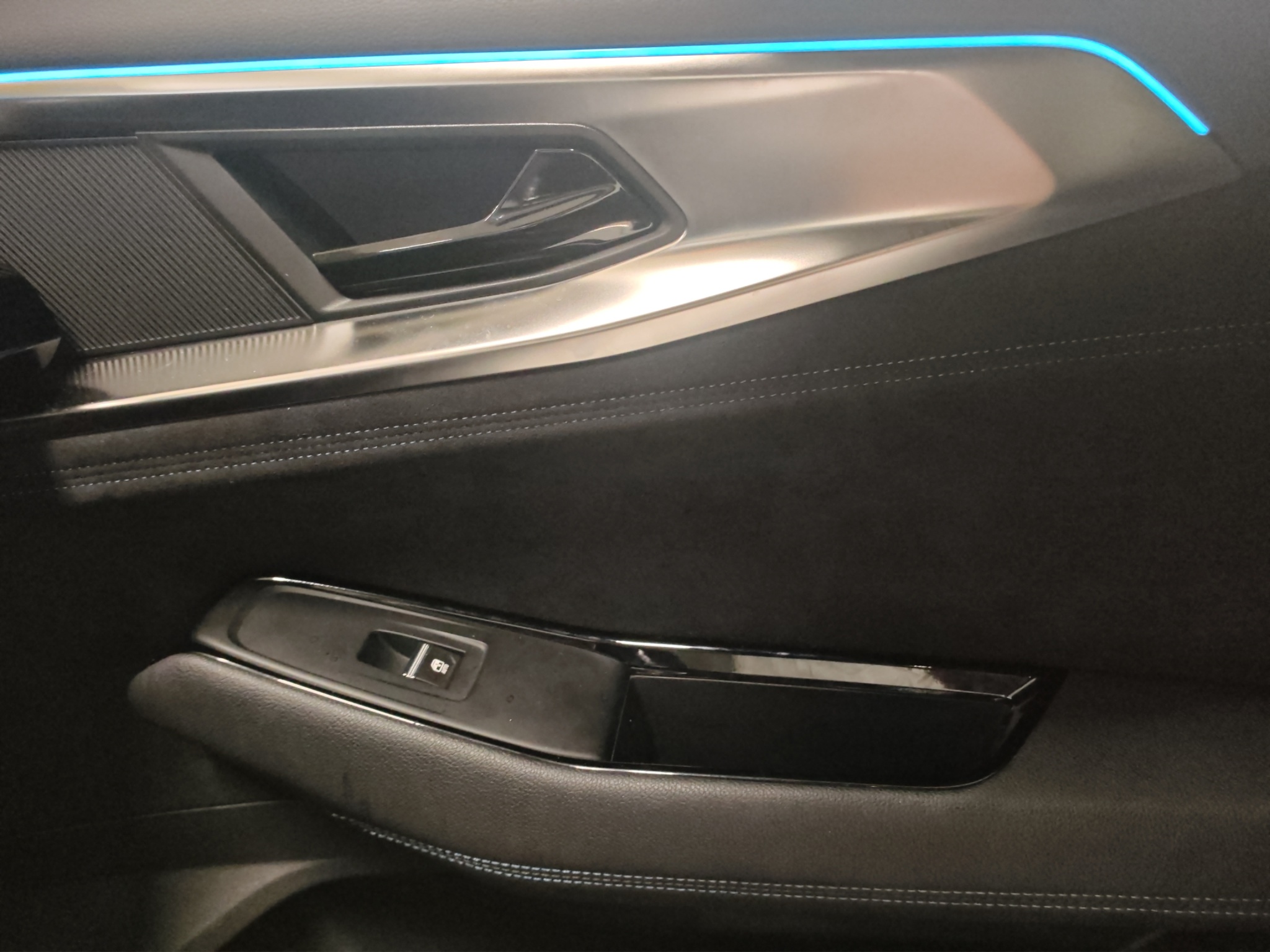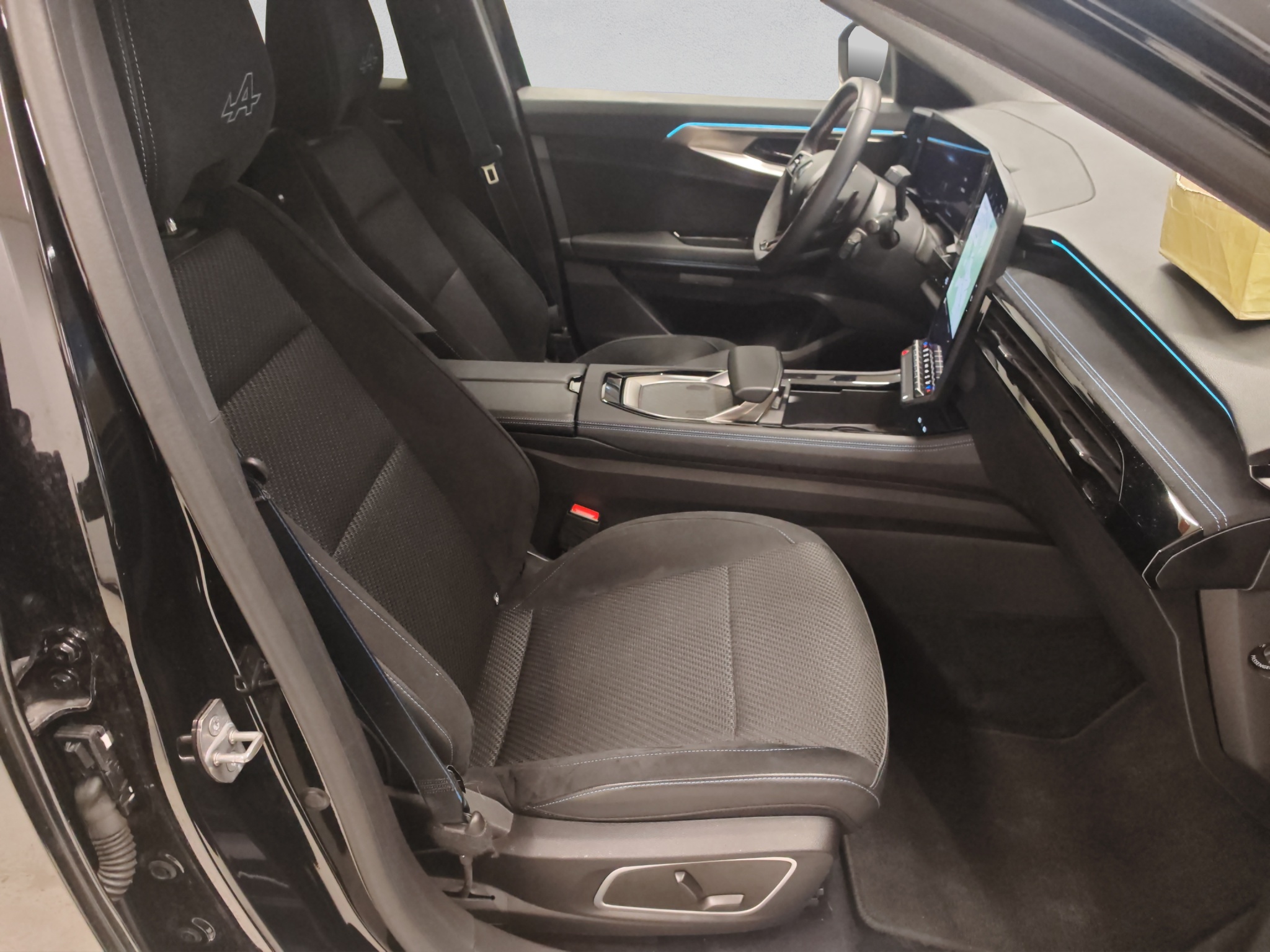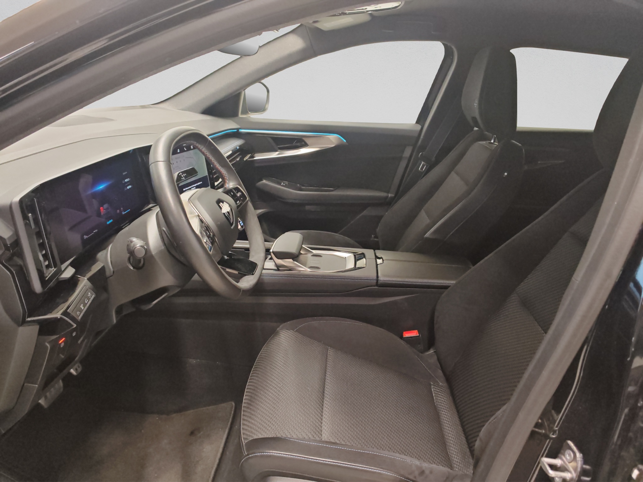 Polster: Stoff-/Alcantarapolsterung dunkel mit blauen Nähten