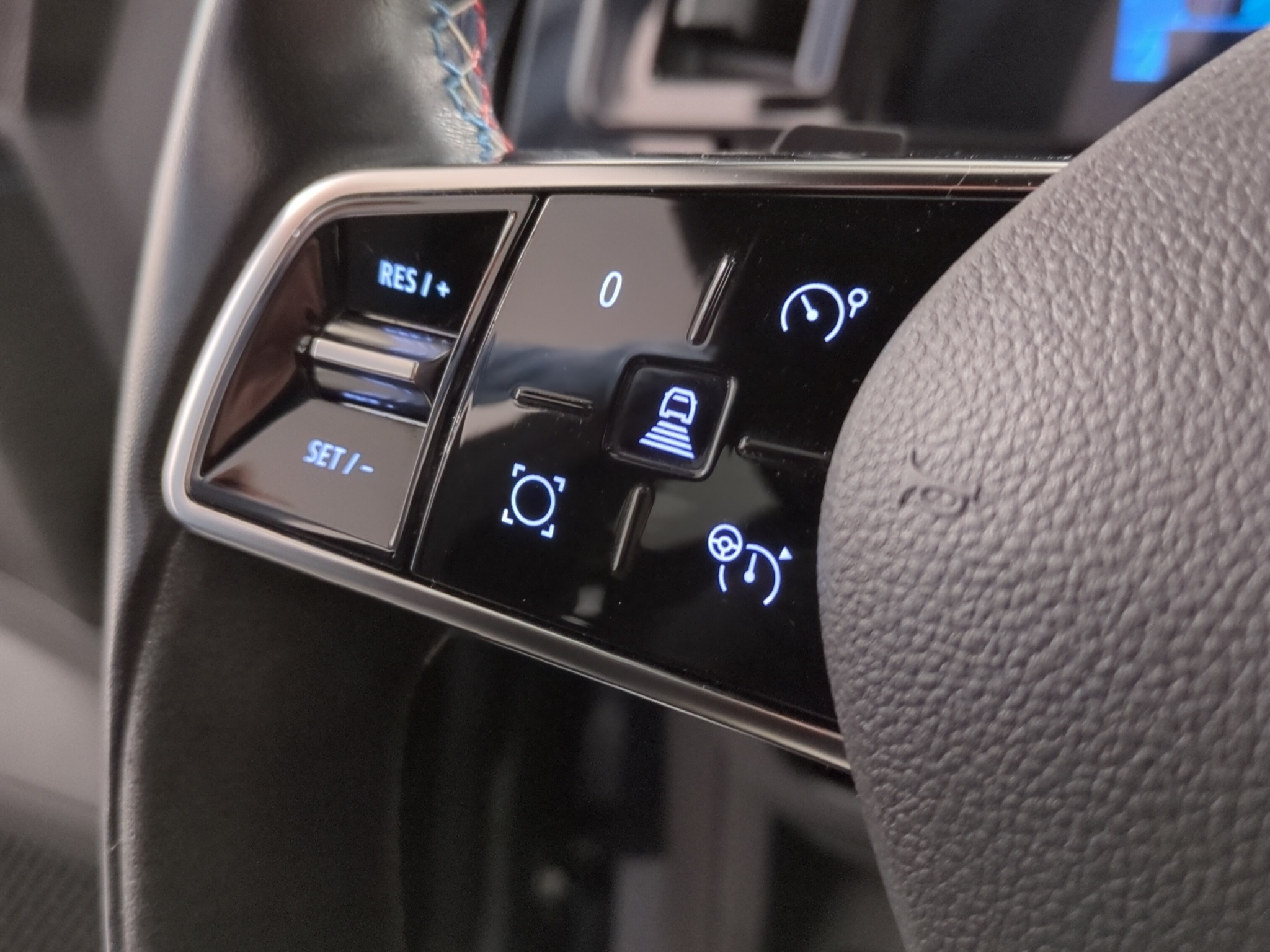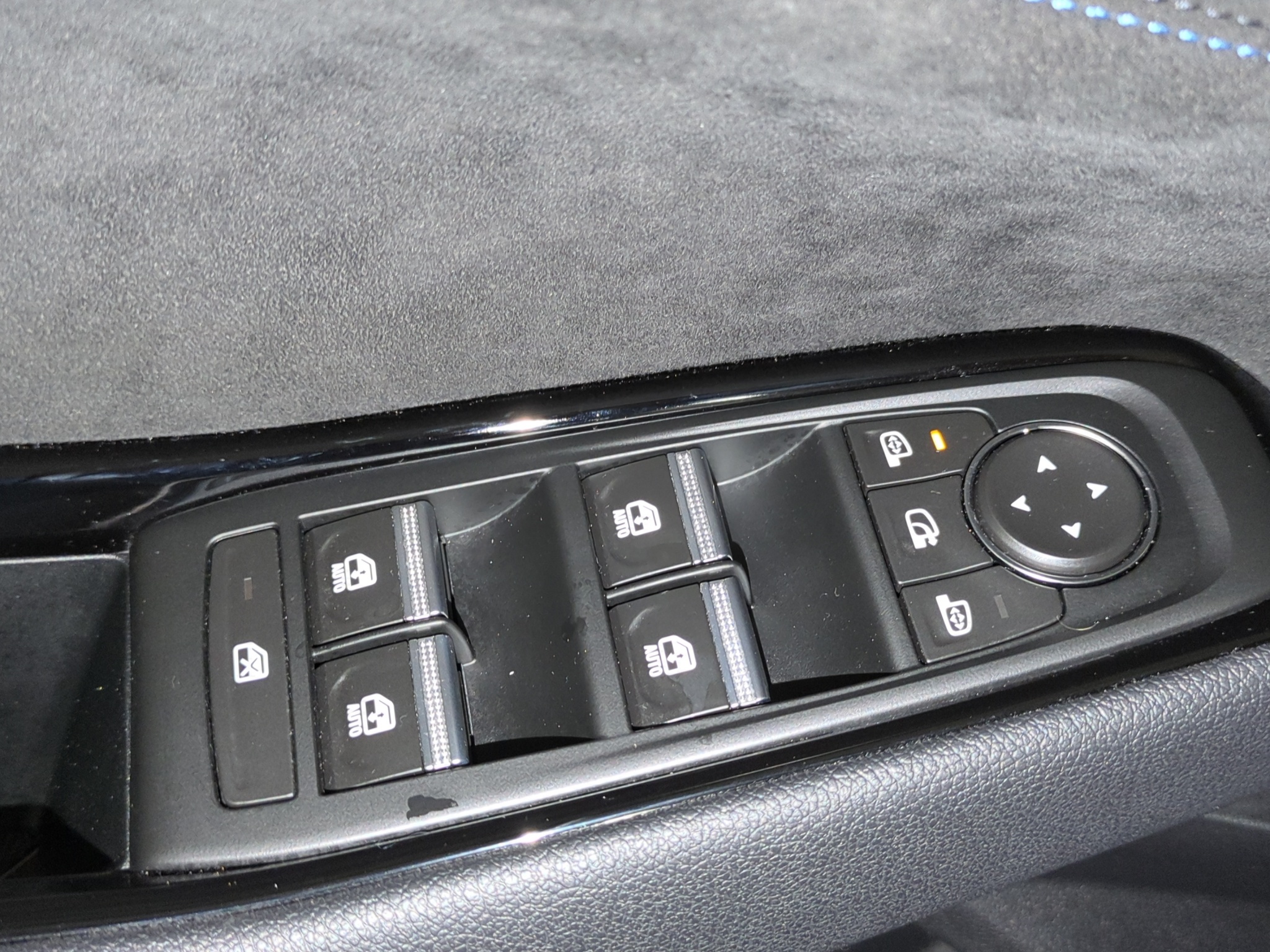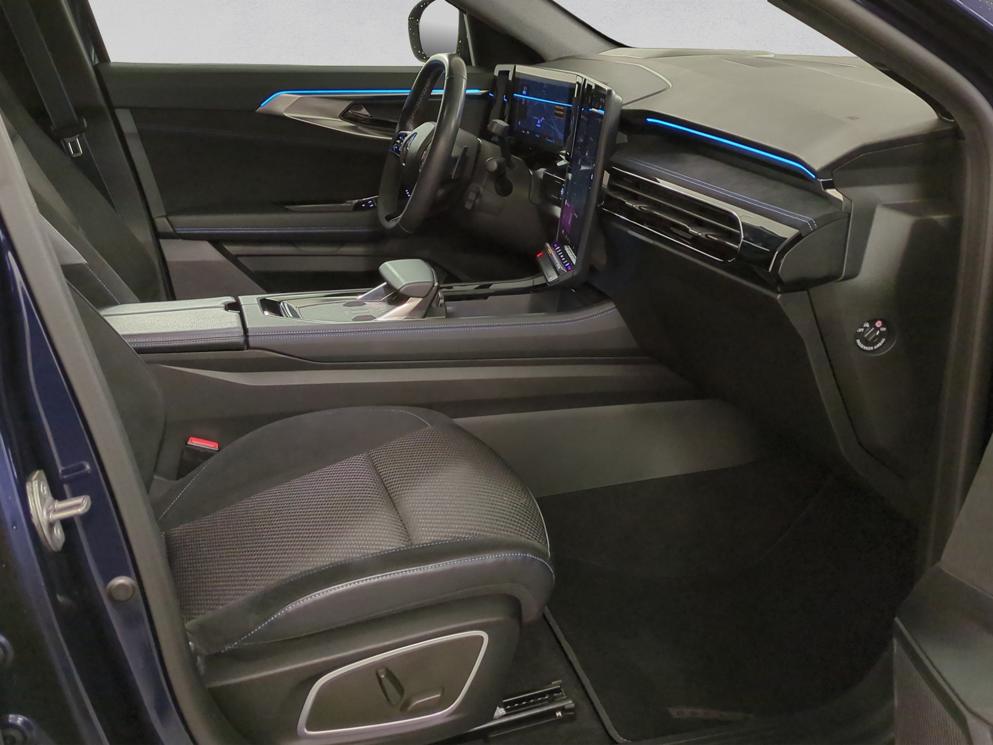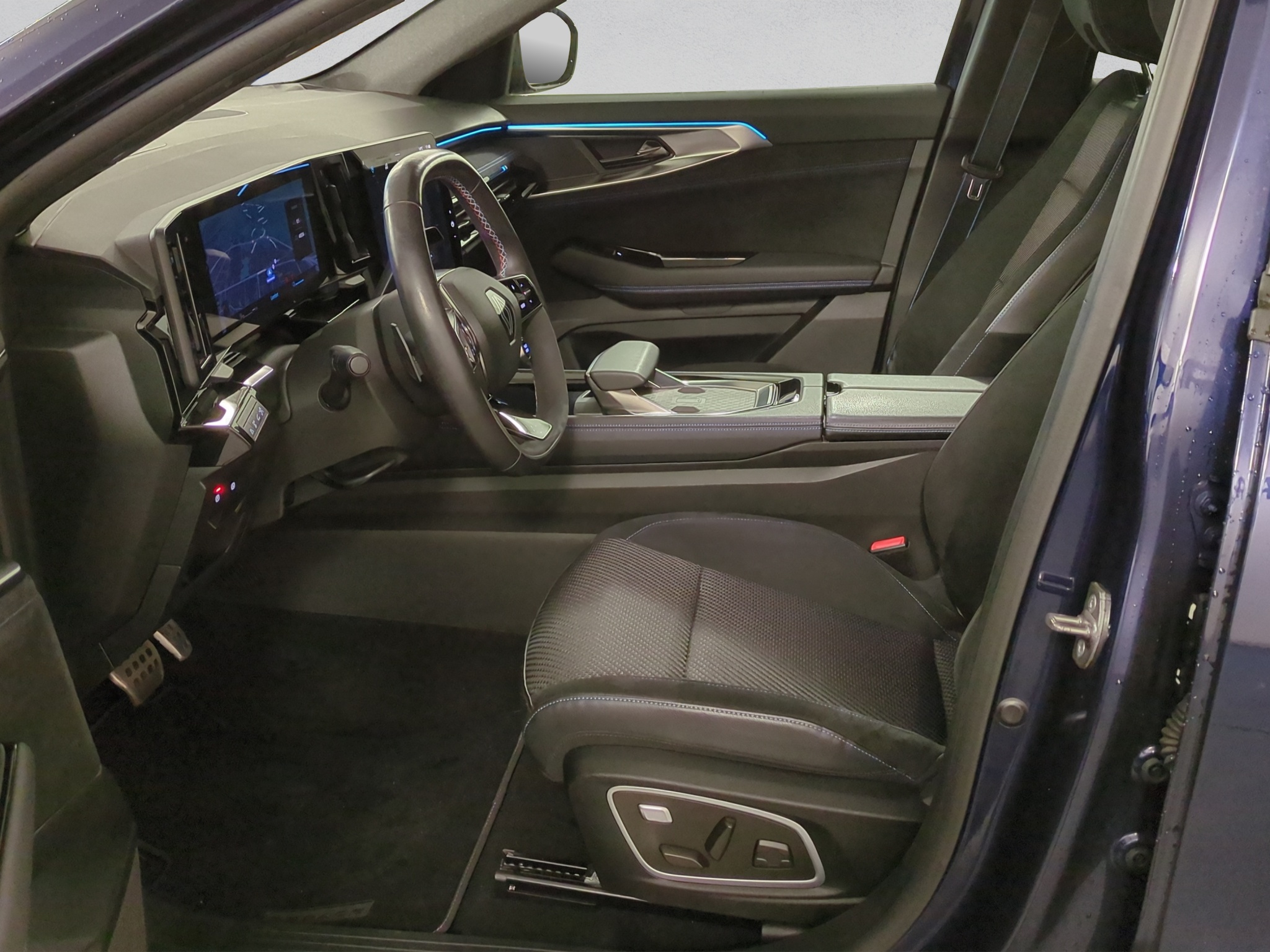 Polster: Stoff-/Alcantarapolsterung dunkel mit blauen Nähten