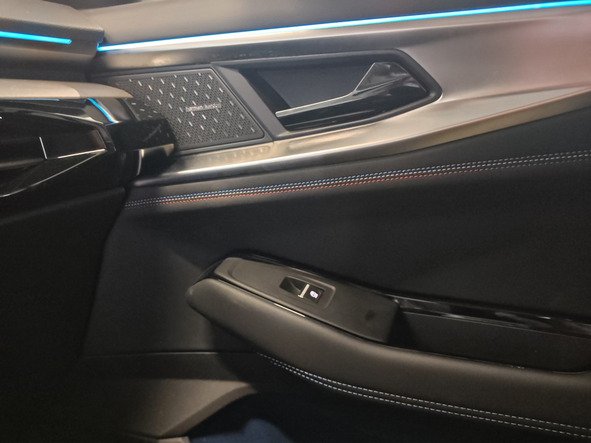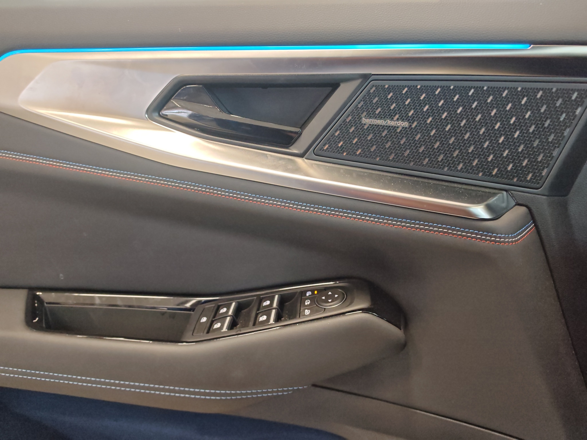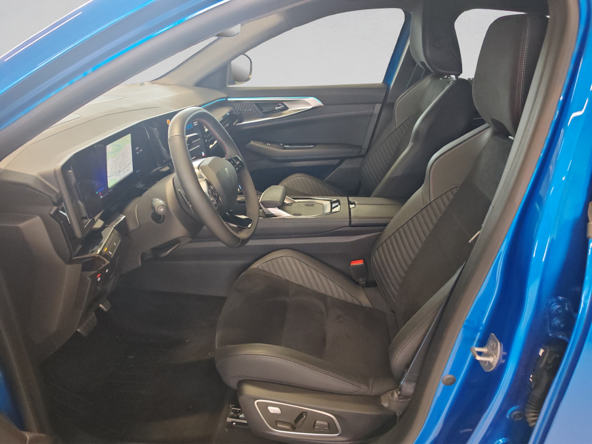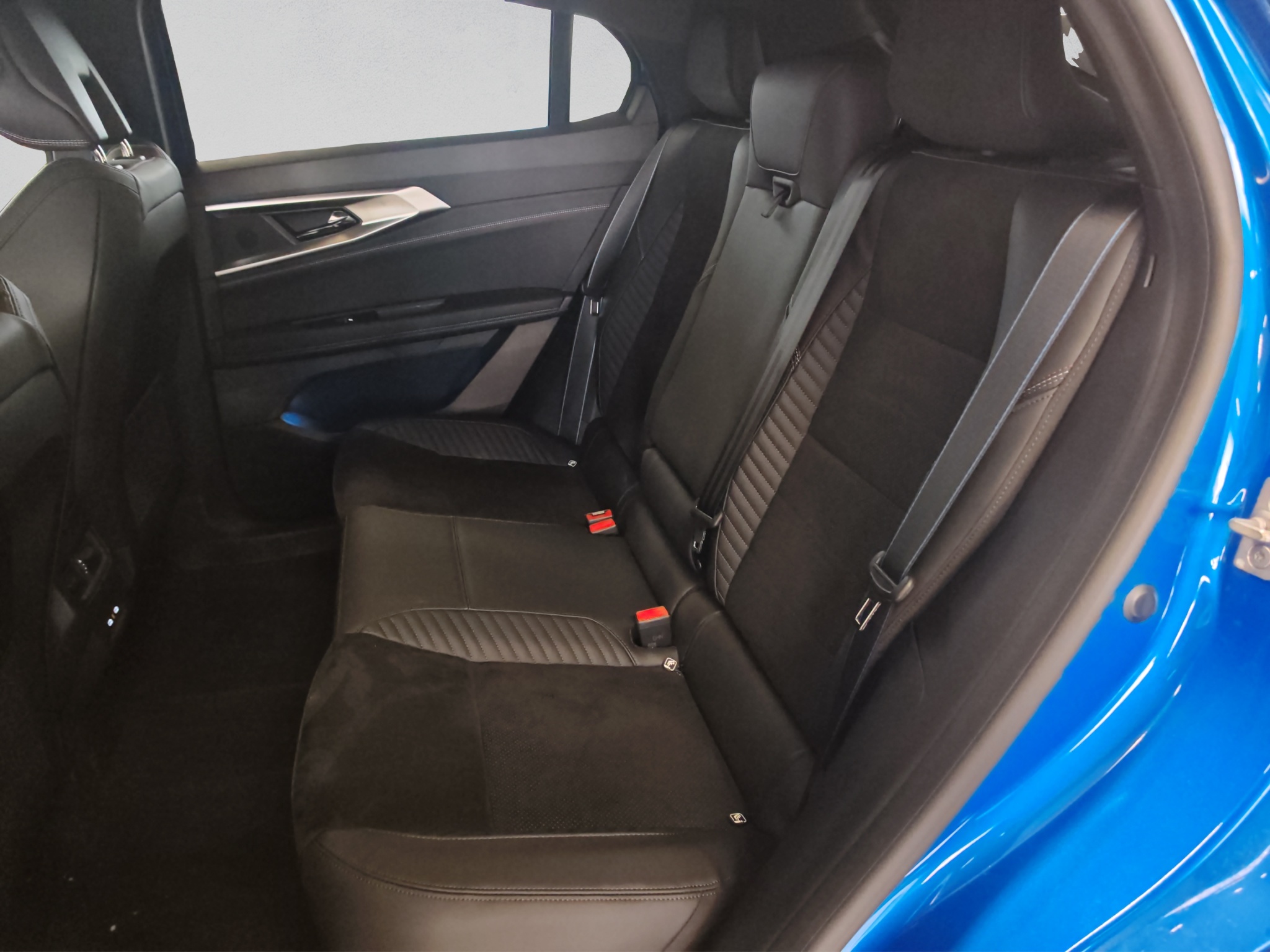 Polster: Stoff-/Kunstlederpolsterung dunkel mit blauen Nähten